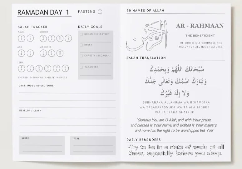 Our journal is simple and easy to use with 2 pages per day to help you to keep track of every day in Ramadan and expand your knowledge.